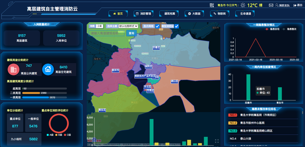 “青島市消防支隊(duì)高層建筑監(jiān)管平臺”采取信息化手段來實(shí)現(xiàn)對高層建筑的隱患排查進(jìn)行分流推送、對隱患整改進(jìn)度進(jìn)行管控,建立數(shù)據(jù)庫和物聯(lián)網(wǎng)監(jiān)管平臺,對高層樓宇進(jìn)行風(fēng)險評估、預(yù)警,給政府、消防、行業(yè)主管、網(wǎng)格員、單位管理員提供抓手進(jìn)行精準(zhǔn)監(jiān)管,同時系統(tǒng)信息可作為安全隱患排查、整改管理和處罰依據(jù),形成閉環(huán)式管理,為政府掌控安全形勢,提供科學(xué)依據(jù),從而形成“人防+技防”的立體化防控體系。