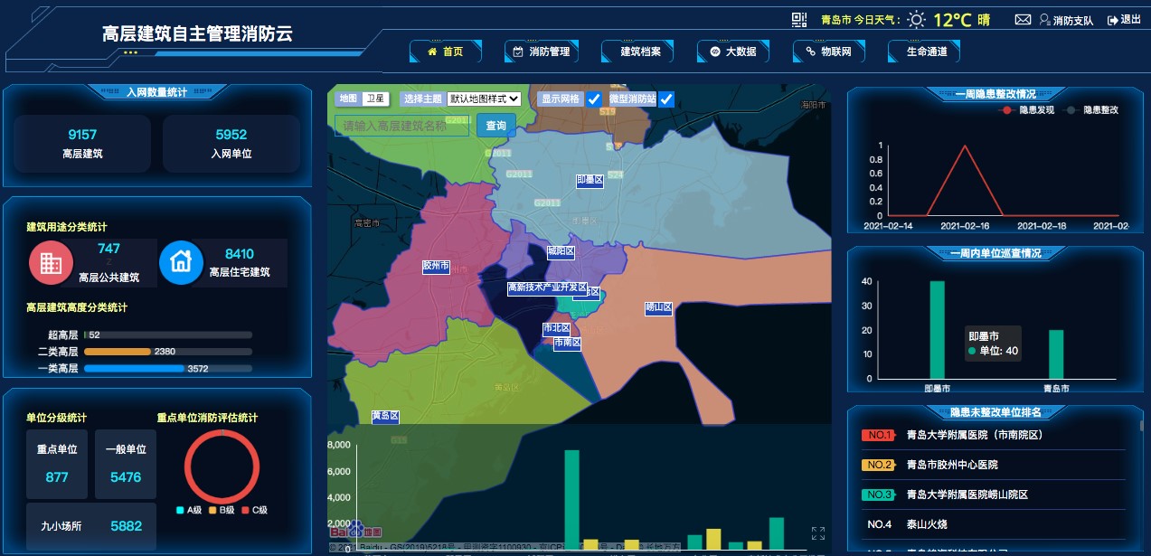 項目采取信息化手段來實現對高層建筑的隱患排查進行分流推送、對隱患整改進度進行管控,建立數據庫和物聯網監管平臺,對高層樓宇進行風險評估、預警,給政府、消防、行業主管、網格員、單位管理員提供抓手進行精準監管,同時系統信息可作為安全隱患排查、整改管理和處罰依據,形成閉環式管理,為政府掌控安全形勢,提供科學依據,從而形成“人防+技防”的立體化防控體系。