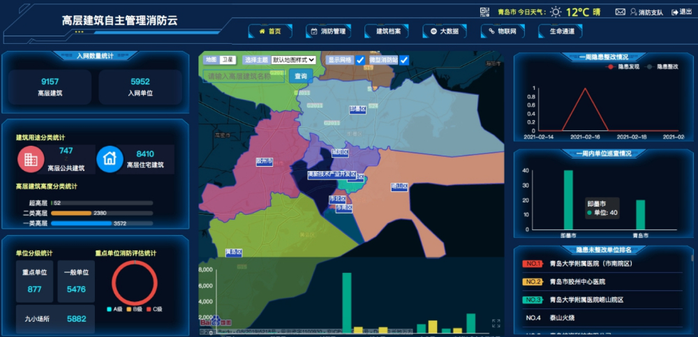據悉,青島市“高層建筑自主管理消防云平臺”采用物聯網信息化手段,建立了全市高層建筑信息數據庫和物聯網監管平臺,可對高層樓宇進行風險評估、預警,給政府、消防、行業主管、網格員、單位管理員提供抓手進行精準監管,同時系統信息可作為安全隱患排查、整改管理和處罰依據,形成閉環式管理,為市政府掌控安全形勢提供了科學依據,從而形成“人防+技防”的立體化防控體系。