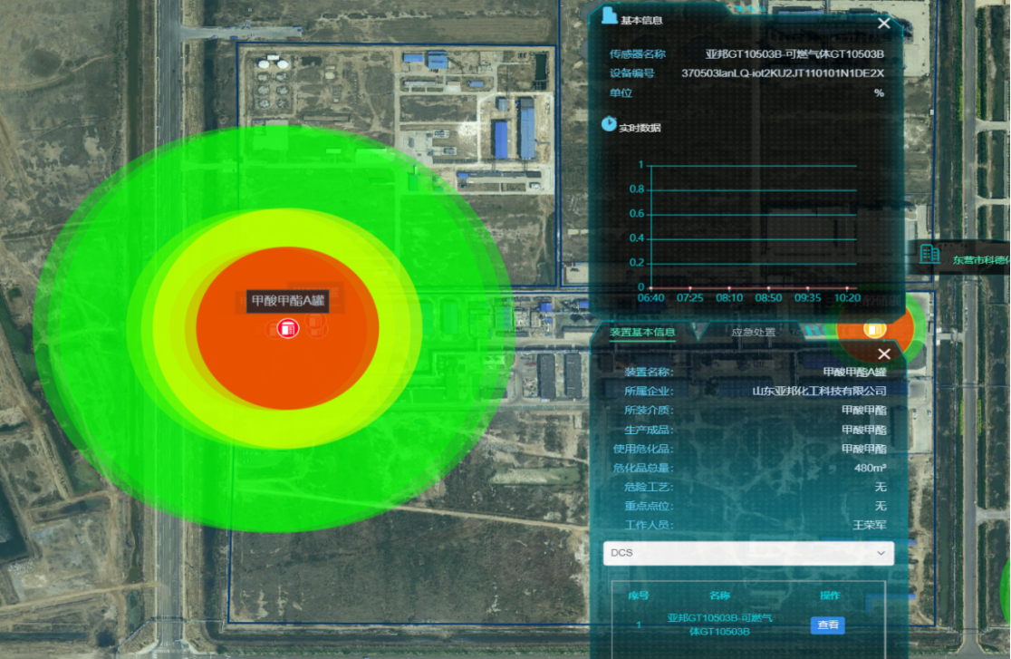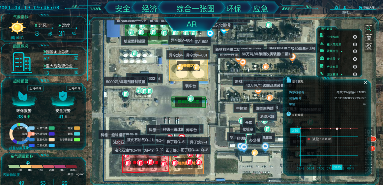 六是綜合防控一張圖,讓隱患無處遁形。“?;穲@區監管子系統”可通過“一張圖”隨時查看?;穲@區全方位實時數據,同時借助物聯網感知設備,可實現24小時監測其化學氣體濃度、空氣質量、電氣、液壓、液位、氣壓、濕度、溫度、風向、風速等數據,根據既定的數據模型,計算分析后,生成實時狀態評估報告,進而督促企業進行整改。