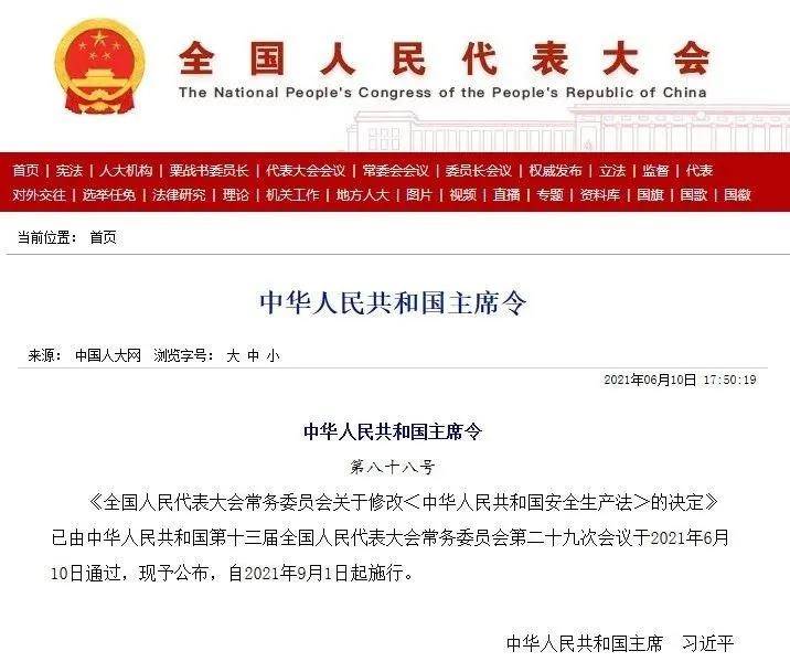 《全國(guó)人民代表大會(huì)常務(wù)委員會(huì)關(guān)于修改<中華人民共和國(guó)安全生產(chǎn)法>的決定》已由中華人民共和國(guó)第十三屆全國(guó)人民代表大會(huì)常務(wù)委員會(huì)第二十九次會(huì)議于2021年6月10日通過,現(xiàn)予公布,自2021年9月1日起施行。