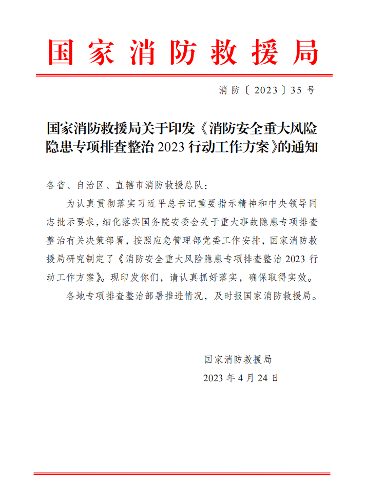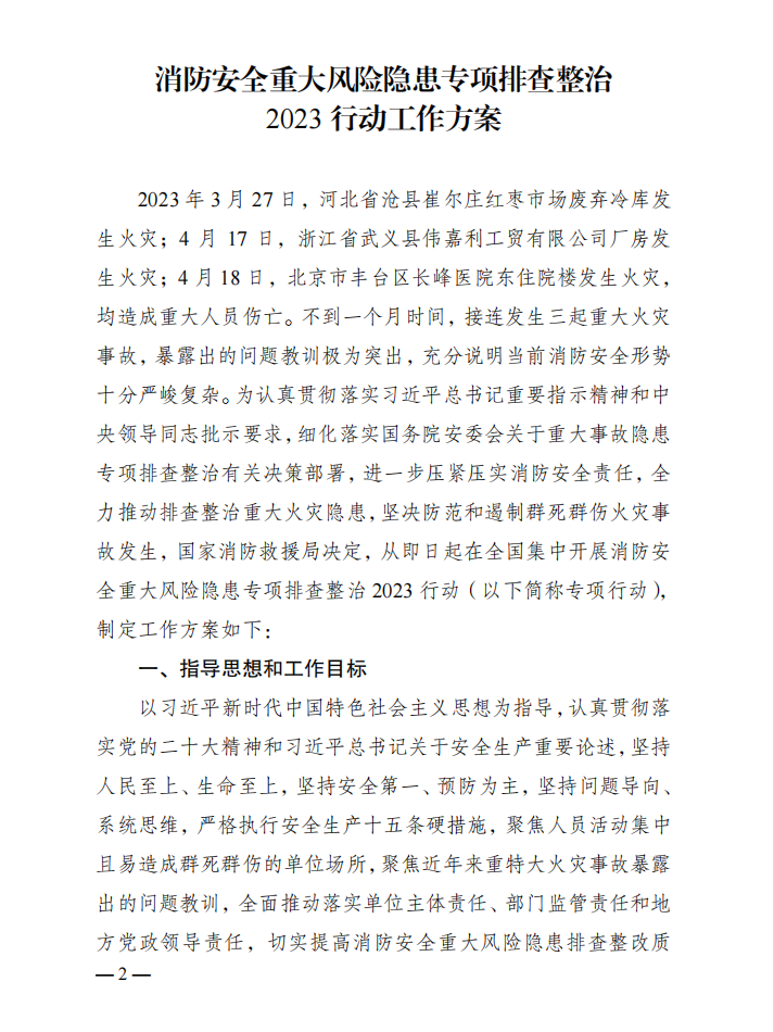 今年二季度,國家消防救援局印發工作方案,部署在全國集中開展消防安全重大風險隱患專項排查整治2023行動,聚焦人員活動集中且易造成群死群傷的單位場所,聚焦近年來重特大火災事故暴露出的問題教訓,全面摸清并動態掌握現階段消防安全重大風險隱患底數,落實嚴格的安全防范措施,有效降低火災風險,堅決遏制群死群傷重特大火災事故發生。