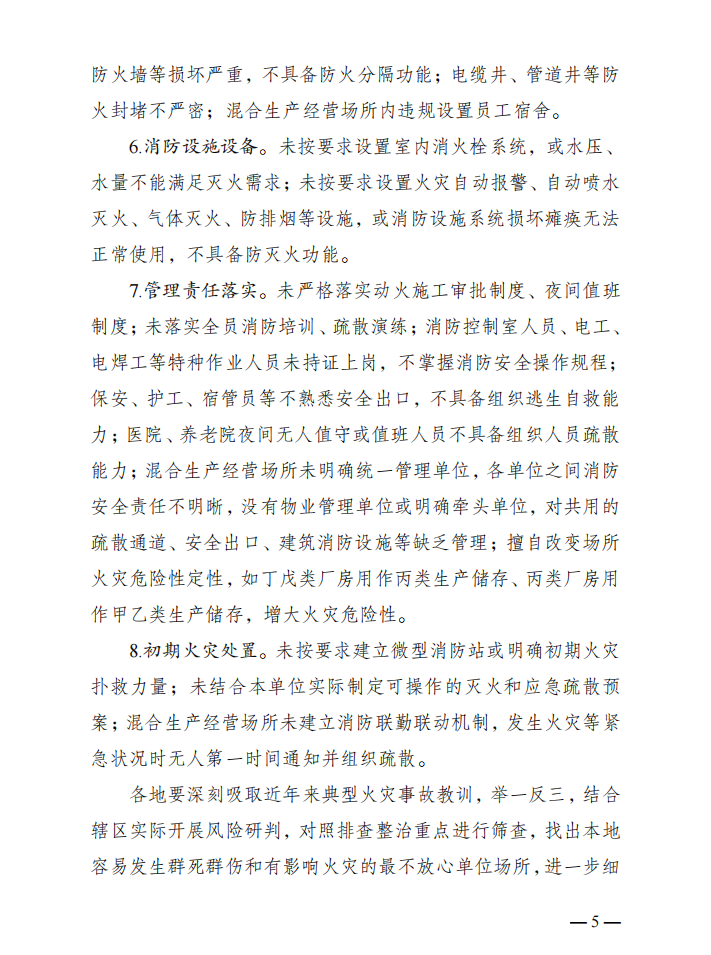 《方案》明確了排查整治的重點場所、突出問題、檢查方式和整改措施。此次排查整治將針對具有較大火災風險、人員活動集中容易造成群死群傷或重大社會影響的人員密集場所、敏感特殊場所、混合生產經營場所。聚焦致災要素,按照火災發生發展的規律,把火源管理、電源管理、易燃可燃保溫材料和裝飾裝修、安全疏散條件、防火分隔、消防設施設備、管理責任落實、初期火災處置等作為排查整治的重點。要求各地深刻吸取近年來典型火災事故教訓,舉一反三,結合轄區實際開展風險研判,對照排查整治重點進行篩查,找出本地容易發生群死群傷和有影響火災的最不放心單位場所,進一步細化排查整治范圍和重點,因地制宜開展倉儲物流、易燃易爆、群租房、“九小場所”等具有地域特點的排查整治。要求各地通過指導單位自查、組織基層排查、推動條線檢查、深化消防檢查的方式,采取集中力量整治、提請政府整治、輿論監督整治、信用監管整治等措施全面整治、強力除患。